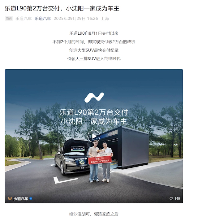 快科技9月29日消息,乐道汽车今日发文宣布,乐道L90自8月1日交付以来,不到2个月的时间恒牛网,即实现交付破2万台的成绩,创造大型SUV最快交付纪录。